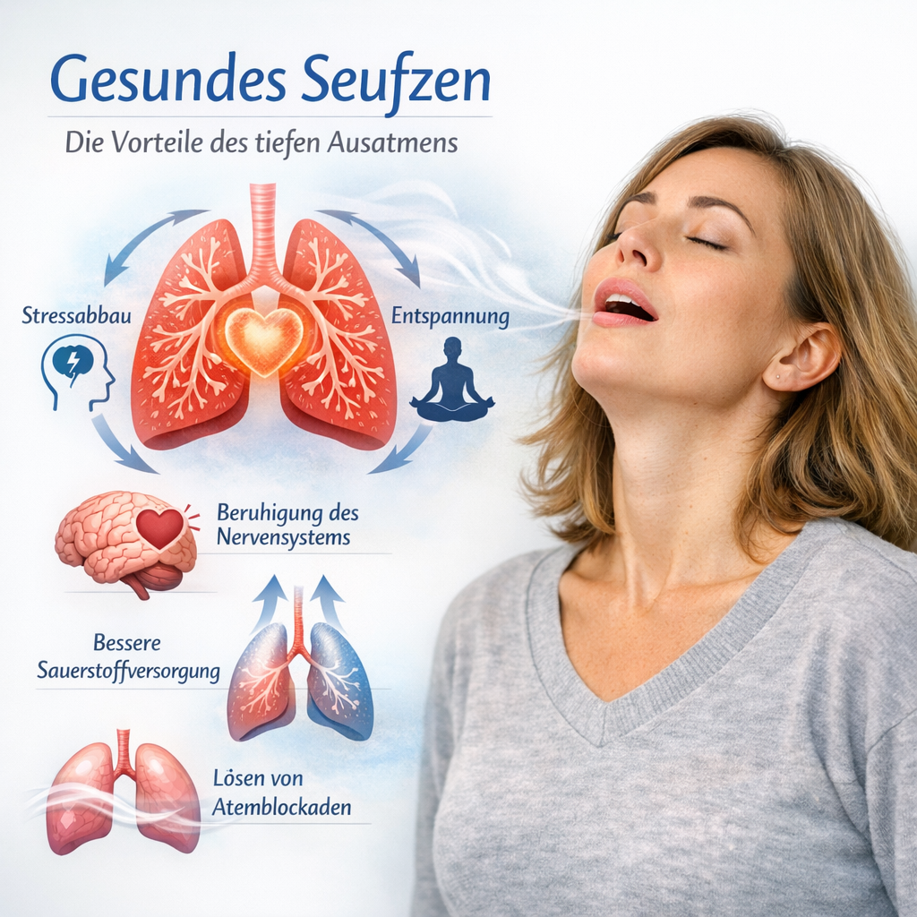 Medizinisch betrachtet hilft ein Seufzer, die feine Surfactant-Schicht in den Lungenbläschen neu zu verteilen. Diese Schutzschicht sorgt dafür, dass die Alveolen offen bleiben und stabil funktionieren. Durch regelmäßige tiefe Atemzüge bleibt die Elastizität der Lunge erhalten, der Gasaustausch verbessert sich und die Lungenfunktion bleibt leistungsfähig.